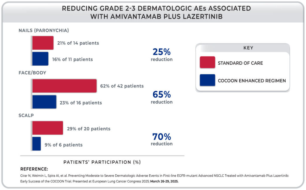 - Girar N, Weimin L, Spira AI, et al. Preventing Moderate to Severe Dermatologic Adverse Events in First-line EGFR-mutant Advanced NSCLC Treated with Amivantamab Plus Lazertinib: Early Success of the COCOON Trial. Presented at European Lung Cancer Congress 2025; March 26-29, 2025.